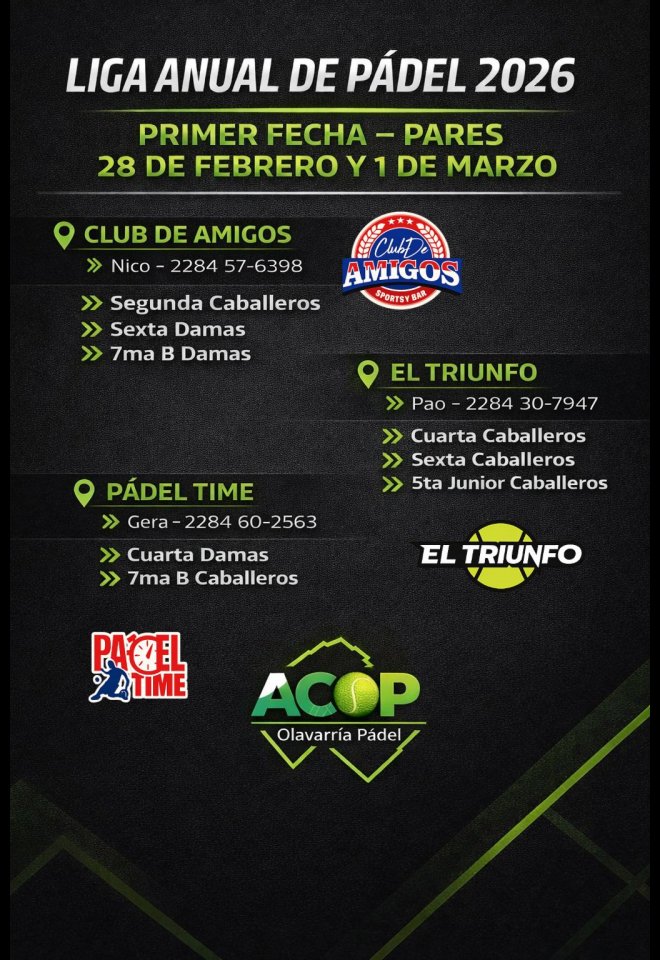 »» Evento: LIGA ACOP 2026 FECHA 1 PARES »» Localidad: Olavarría »» Fechas: 26/02/2026 al 01/03/2026